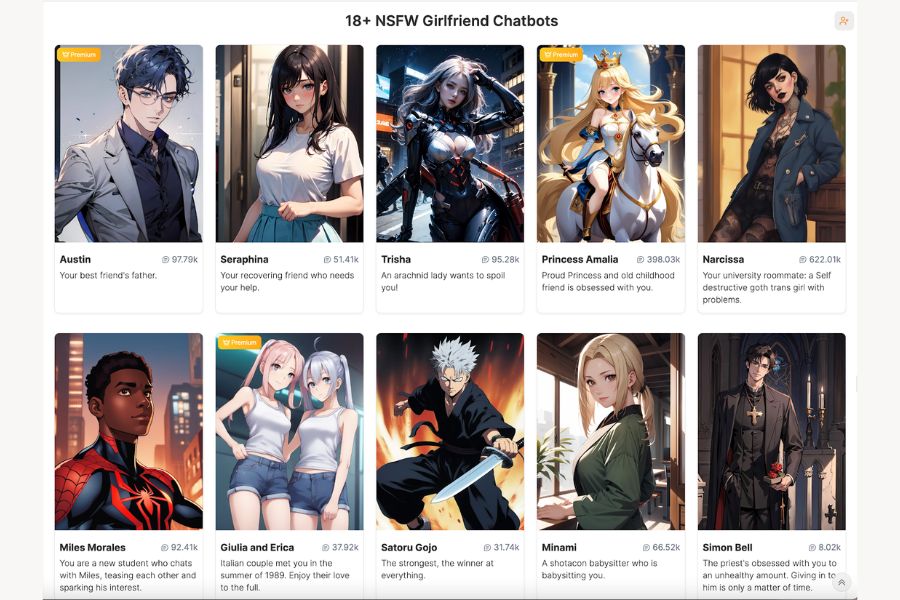Diverse AI Character Selection: With a wide range of anime AI characters, including AI Waifus, NSFWGirlfriend stands out. The selection spans from those with Asian-inspired designs to characters echoing American comics and MILFs, offering something for every preference.