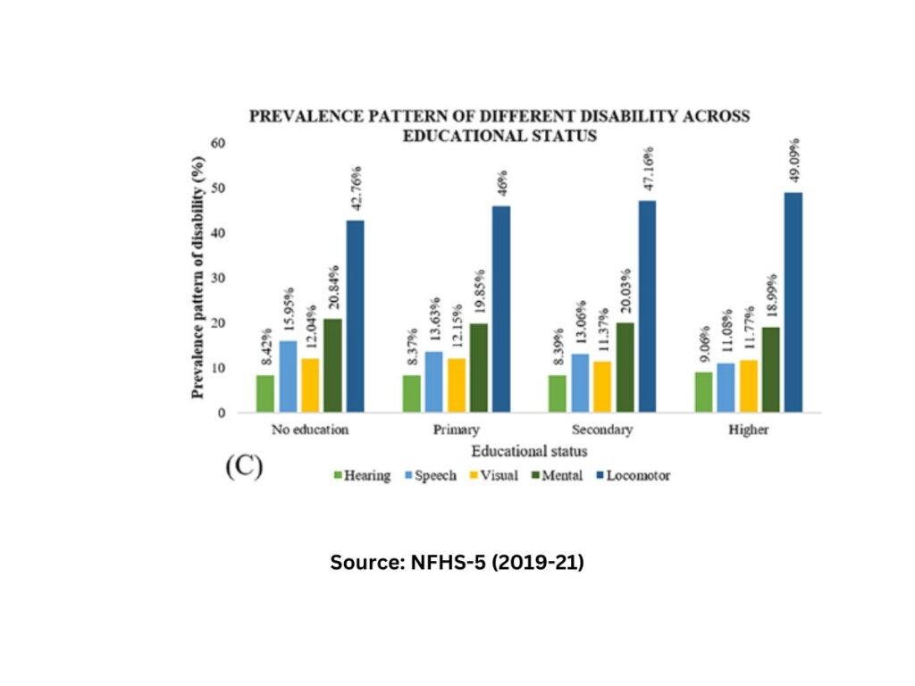 • 49% of all people with locomotor disability have higher education. A huge disparity coexists with all other disability; meager 19% mental and 11% visual and speech related person with disability have higher education.